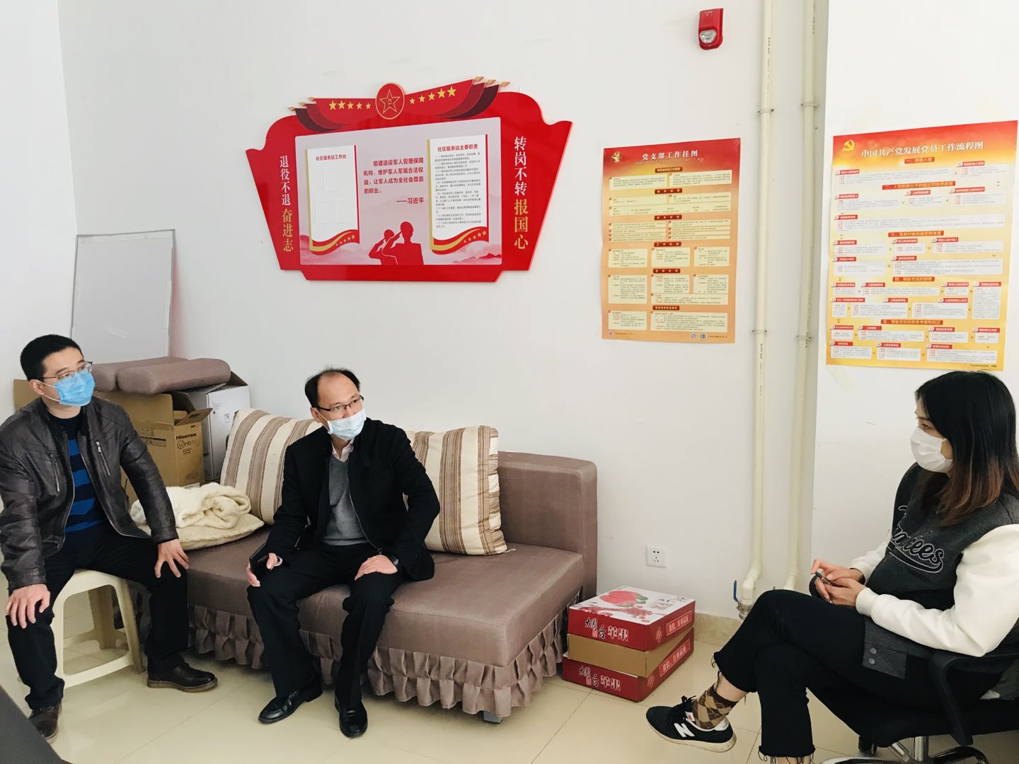4月3日下午,太阳集团网tyc9728分党委书记尹逊涛、副书记石俊山、辅导员朱勇三人一行来到“双报到”华润社区进行对接座谈,华润社区党支部书记、居委会主任迟家祯参加座谈。