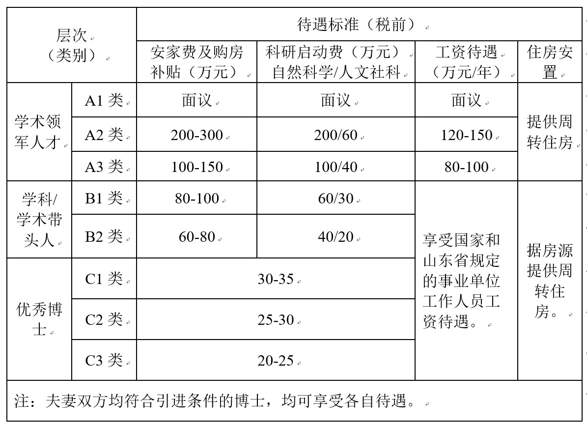 一次性待遇:一次性待遇(包括购房补贴、安家费及科研启动费)按照不同层次给予不同补贴;特别优秀的博士可一事一议。